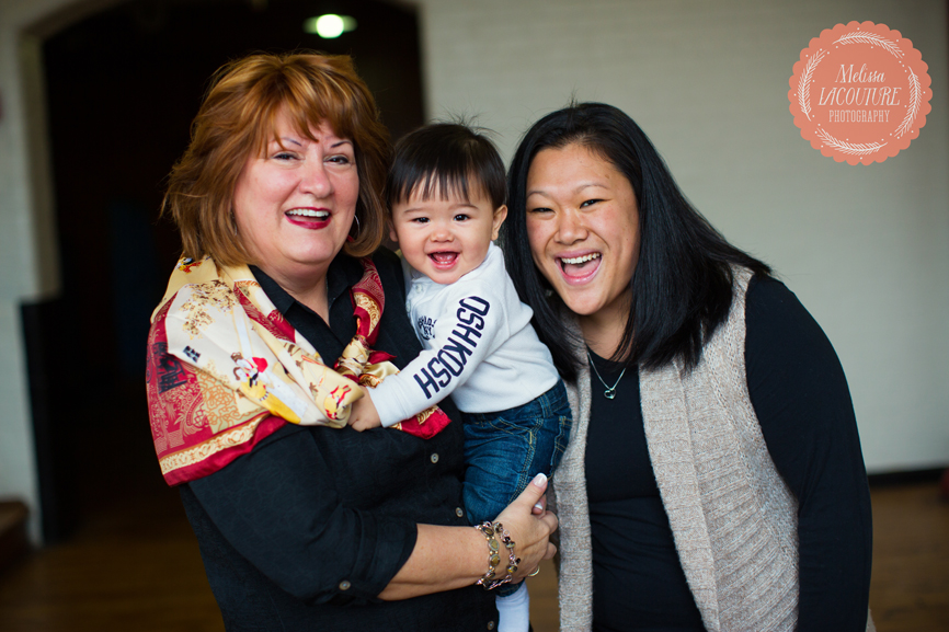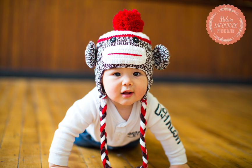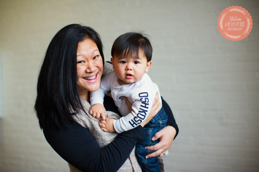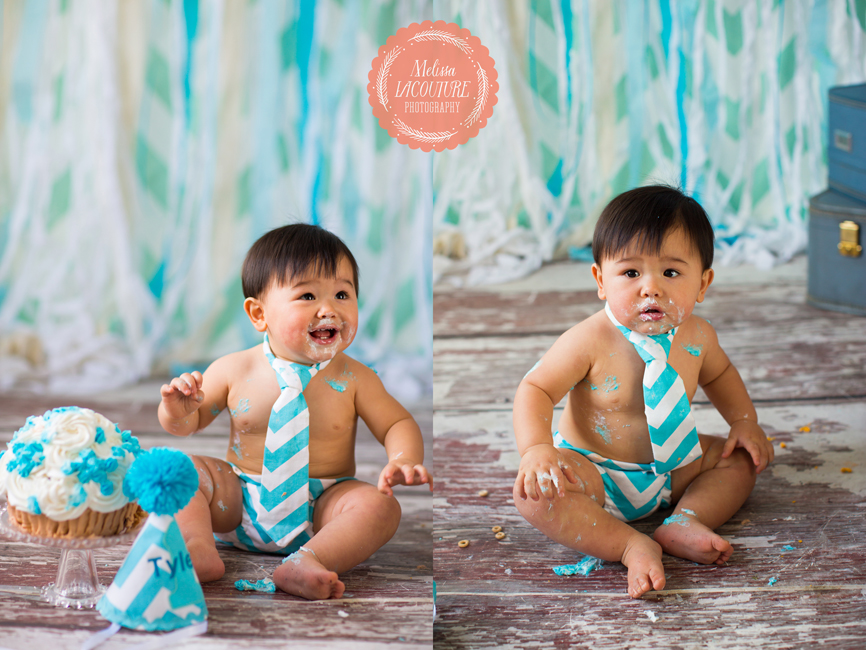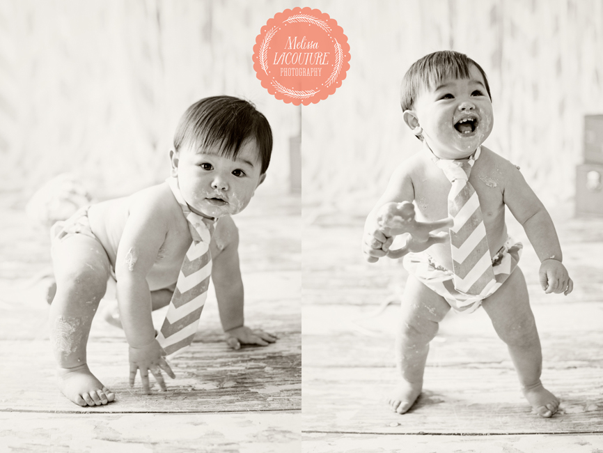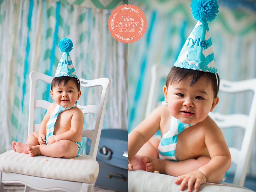 Tyler is one year old! What a fun and special birthday it is! His Grandmother and Mom were on hand for the photos and you can see that this little guy gets all the love he needs from these ladies. I had so much fun chatting with them that I almost forgot to take photos! They brought the cutest cake smash outfit for him – a little hat, tie and diaper cover with a chevron print (my new fave pattern!). I’m so happy that people are putting out some cute stuff for boys to wear at these! Why should girls have all the fun? Tyler decided to give us a show stopper at the end of the session. He stood up without any help for the first time ever right in my studio!! Unfortunately I didn’t document it the first time because I was not ready. Thankfully he gave us an encore and I got it!! Such a treat that I was able to capture that moment for his family.