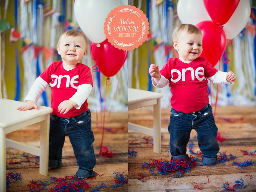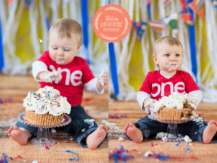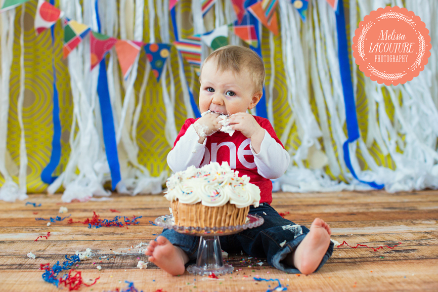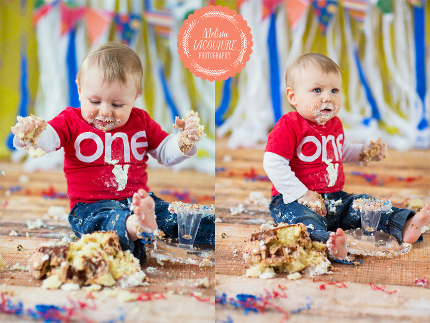 Whenever I do a cake smash parents get a little thrown off by the name. Babies rarely ever actually “smash” the cake. I always reassure them that what their baby is doing is normal. Sometimes they just play with it and get really mad when the frosting is stuck to their hands. Sometimes they actually sit quietly and eat it! But Smash?! Nope. I used to say that no baby has ever smashed the cake. Now I have to change that sentence to “except that one”… I met Miles when he was just a newborn. I had the pleasure of going to his house and taking photos when he was just born. Now we meet again, one year later! He has grown up to the a sweet little man. We had a great time taking photos and Miles has an amazing time destroying his cake made by Cake-tique. He will probably never throw cake like that again for the rest of his life so I’m happy I was there to capture it! Happy Birthday, Miles!!