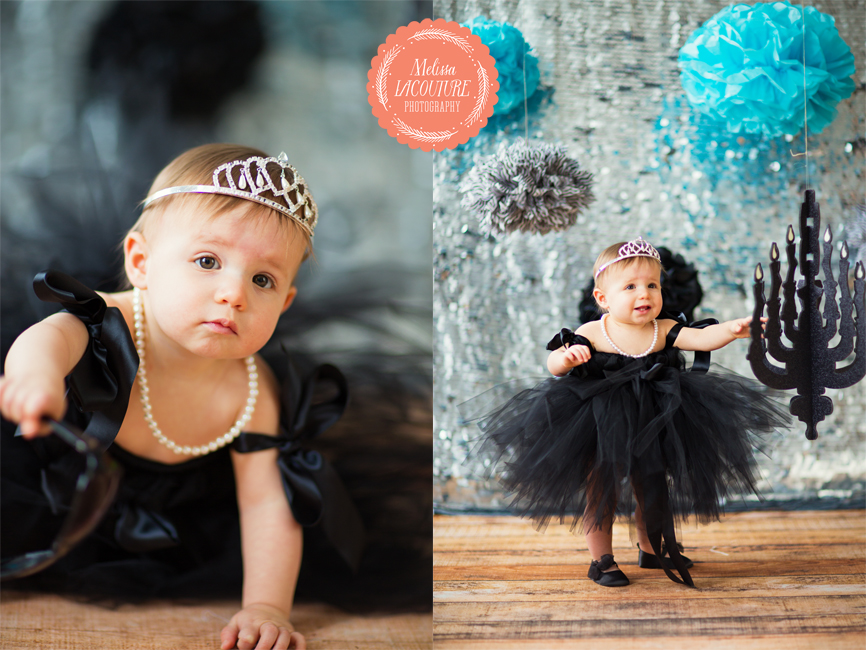 For a first birthday I think you should really celebrate! It’s THE first birthday ever!! It’s a big deal in my opinion. Aurora’s Mom shares this sentiment. They are throwing Aurora a glamorous Breakfast at Tiffany’s birthday party! How amazing is that? Thankfully she brought lots of the things they have to decorate the party. We were able to use everything to make a fabulous little set for Aurora to shine in! When we finished with the glamour I switched over to the delicate little Spring Mini Shoot set I have at the studio now for a cake smash with cake made as always by Lauren at Cake-tique! Such a treat for me to be able to help Mom’s vision come to life!